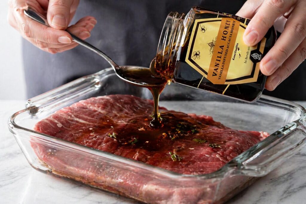 Vanilla contains aromatic compounds like vanillin that complement the Maillard reaction, the browning process that gives steak its rich, umami-packed crust. When done correctly, vanilla doesn’t make your steak “sweet” instead, it deepens the overall flavor, adding a smooth, almost buttery complexity while adding mild sweetness that balances the savory flavor or umami or the steak.